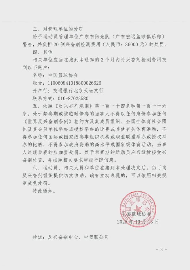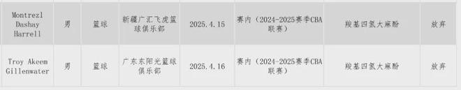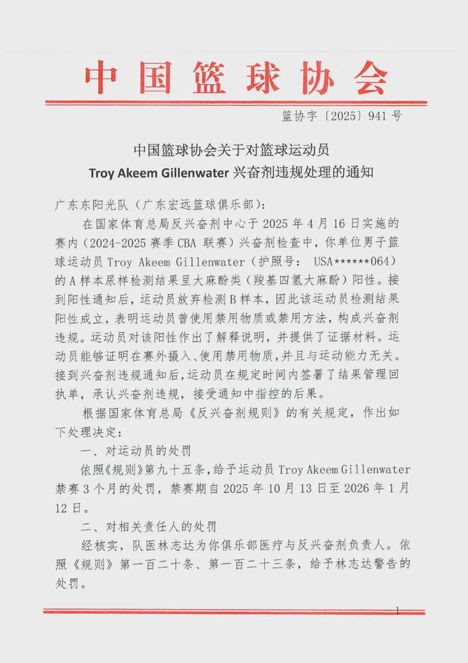 昨天(10月13日),中国篮球协会给广东东阳光队(广东宏远篮球俱乐部)下发《关于对篮球运动员Troy Akeem Gillenwater兴奋剂违规处理的通知》。通知提到,对兴奋剂违规的中国男子篮球职业联赛(CBA)外援吉伦沃特处以禁赛3个月的处罚。通知表示,在国家体育总局反兴奋剂中心于2025年4月16日实施的赛内(2024-2025赛季CBA)兴奋剂检查中,广东东阳光队(广东宏远篮球俱乐部)男子篮球运动员Troy Akeem Gillenwater(吉伦沃特)的A样本尿样检测结果呈大麻酚类(羧基四氢大麻酚)阳性。接到阳性通知后,运动员放弃检测B样本,因此该运动员检测结果阳性成立,表明运动员曾使用禁用物质或禁用方法,构成兴奋剂违规。运动员对该阳性作出了解释说明,并提供了证据材料。运动员能够证明在赛外摄入、使用禁用物质,并且与运动能力无关。接到兴奋剂违规通知后,运动员在规定时间内签署了结果管理回执单,承认兴奋剂违规,接受通知中指控的后果。根据国家体育总局《反兴奋剂规则》的有关规定,作出如下处理决定:一、对运动员的处罚依照《规则》第九十五条,给予运动员Troy Akeem Gillenwater禁赛3个月的处罚,禁赛期自2025年10月13日至2026年1月12日。二、对相关责任人的处罚经核实,队医林志达为该俱乐部医疗与反兴奋剂负责人。依照《规则》第一百二十条、第一百二十三条,给予林志达警告的处罚。三、对管理单位的处罚给予运动员管理单位广东东阳光队(广东宏远篮球俱乐部)警告,并负担20例兴奋剂检测费用(人民币:36000元)的处罚。4月19日,广东东阳光队球员吉伦沃特(右二)在CBA比赛中。新华社发根据中国反兴奋剂中心在6月23日发布的公告显示,广东东阳光篮球俱乐部的Troy Akeem Gillenwater(吉伦沃特)和新疆广汇飞虎篮球俱乐部的Montrezl Dashay Harrell(哈雷尔)分别在CBA联赛4月16日和15日的赛内检测中被查出羧基四氢大麻酚阳性,两人均放弃B瓶检测。据新华社报道,记者从中国篮协了解到,吉伦沃特和哈雷尔的大麻酚阳性事件是同时期出现,但是哈雷尔对其大麻酚阳性结果给出的相关证据还在核实过程中。因此,中国篮协先公布了对吉伦沃特的处罚决定,对哈雷尔的处罚决定将另行公布。在2024-2025赛季常规赛中,吉伦沃特场均出战29.9分钟,场均贡献25.9分、7.3个篮板和2.0次助攻。南方都市报(nddaily)综合报道