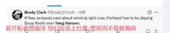 反观里斯则是抓住了机会,他在第二节替补登场6分40秒,贡献6中3的投篮表现,尤其是外线三分5中3,屡屡外线开火单节得到9分1助攻,在场正负值+7。尽管里斯下半场仅有1分钟0未能得分,但他第三节尚未过半就获得登场机会,并在末节还曾经短暂登场。里斯此役替补登场12分10秒,已经超过他赛季前4场的出场时间总和,且得到9分1篮板2助攻,已经超过前4场得分总和,在场正负值+4,成为开拓者的板凳奇兵之一。 舆论盛赞+临时主帅赛后回应启用里斯正如美国网友在社媒呼吁:“如果开拓者想要赢球,就应该使用里斯,而不是杨瀚森。”