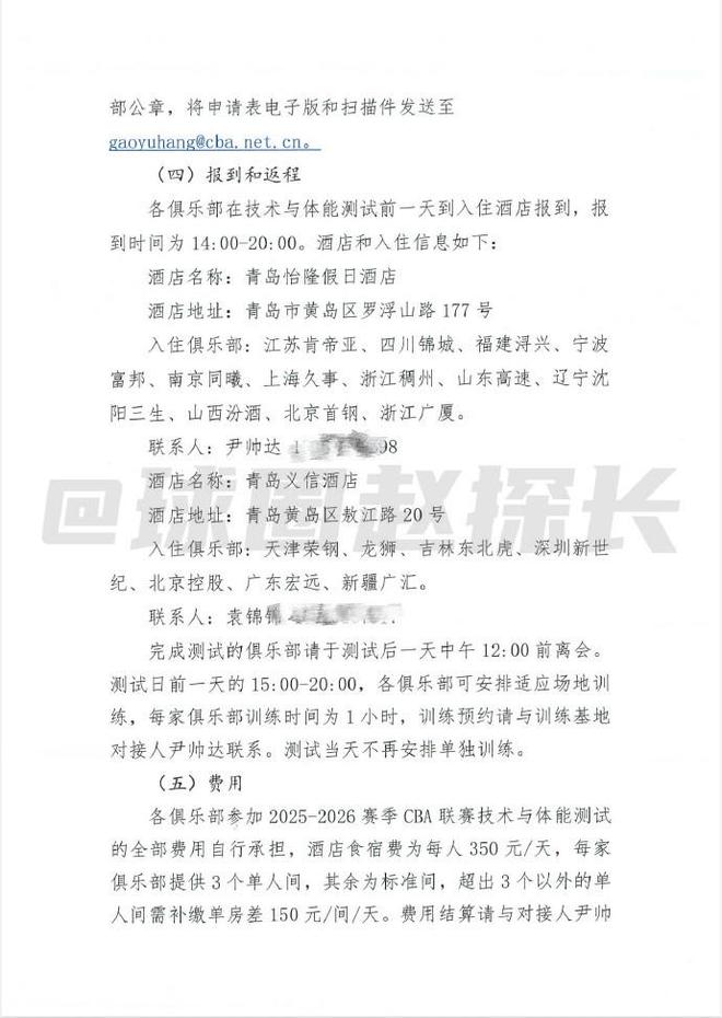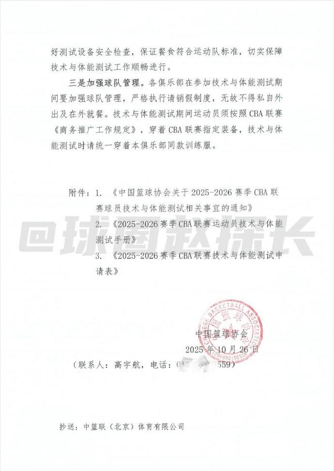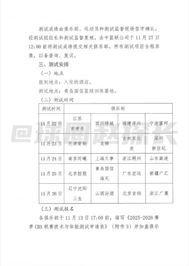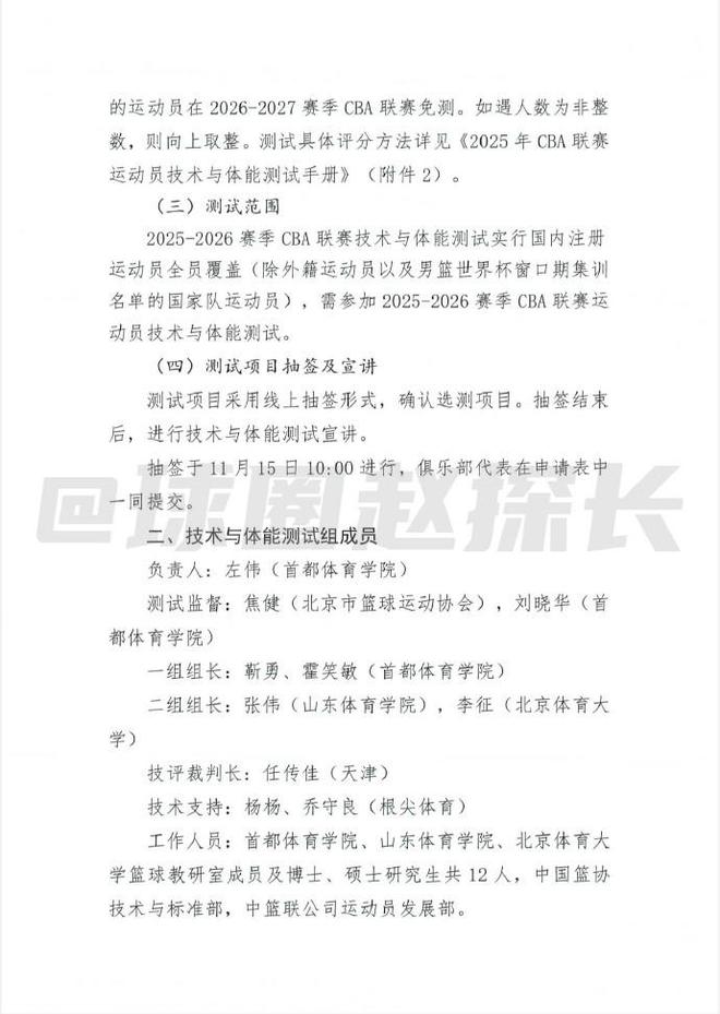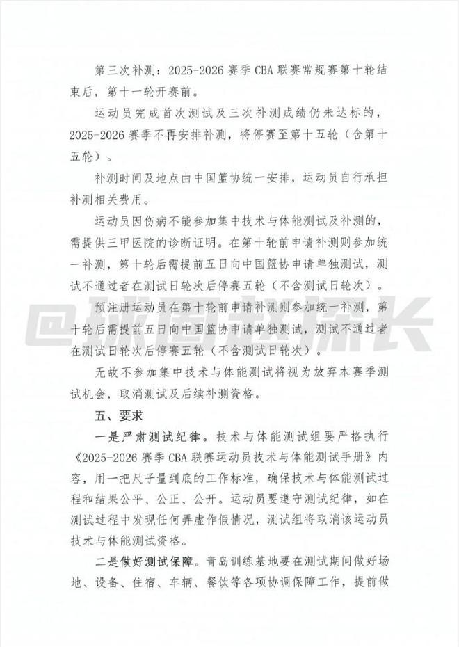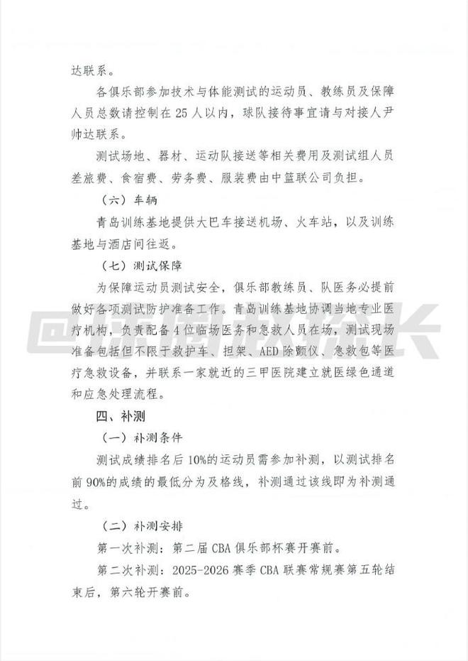 球圈赵探长社媒据探长了解,中国篮协已向CBA各俱乐部下发新赛季体测通知。体测分为五类:篮球静态身体指标测量、篮球动态身体素质测试、投篮技术测试、综合体能测试、选测项目,选测项目要由抽签决定。体测覆盖CBA注册的全部本土球员,参加男篮世预赛窗口期集训的队员免测、外援免测。体测不规定具体达标线成绩,但规定综合排名90%达标、综合排名前10%下下赛季免测、综合排名后10%的算未达标。未达标的有三次补测机会,补测也没有具体达标成绩,而是根据首测前90%的最低分为达标线。补测费用由运动员自行承担,如果三次补测都不过,则新赛季常规赛前15轮停赛。预注册运动员同样要参加补测。测试地点在青岛俱乐部,所有因体测产生的费用各俱乐部自行承担。
