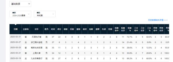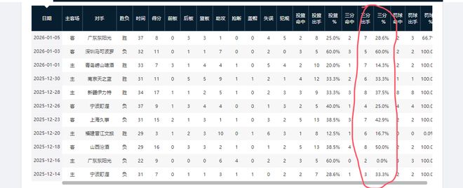 前六场比赛,他的三分命中率依次是33.3%,0%,50%,16.7%,42.9%,25%。
