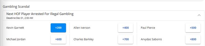 作为名人堂成员的比卢普斯已经被捕,谁会是下一位被捕的名人堂球员?目前赔率显示,加内特(+200)高居榜首,赔率排在他后面的依次是艾弗森、皮尔斯、乔丹、巴克利和萨博尼斯。从目前的调查趋势来看,这次风暴或许才刚刚开了个头。