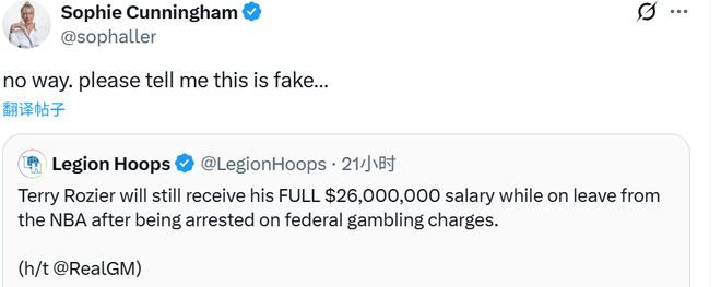 雷速体育10月26日讯 根据美媒近日的报道,热火球员罗齐尔因非法投资指控被捕。NBA已经要求涉事的罗齐尔以及开拓者主教练比卢普斯离开球队,行政休假。RealGM报道称,在NBA行政休假期间,罗齐尔仍将获得他全部2600万美元的薪水。狂热球员坎宁安评论:“不会吧!请告诉我这不是真的。”