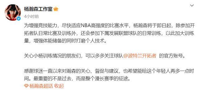 随后,杨瀚森工作室更新社媒发声:“为增强竞技能力,尽快适应NBA高强度的比赛水平,杨瀚森将于即日起,除参加开拓者队日常比赛及训练外,还会参加下属发展联盟球队的日常训练,以此加大训练量,增强体能储备的同时打磨个人技术。”工作室表示:“关心小杨训练情况的朋友们,可以多多关注球队的官方账号。感谢球迷一直以来对瀚森的关心、督促与建议,也希望能给这个年轻人再多一点时间。最重要的不是过去,而是整个漫长赛季的征途。”本赛季NBA常规赛,杨瀚森场均出战5.8分钟,仅得到1.8分0.8篮板0助攻0抢断0.4盖帽0.6失误0.8犯规,投篮命中率22.2%。此前开拓者109-107险胜掘金,杨瀚森NBA生涯第一次被DNP(没有出场),而且他是开拓者比赛大名单当中,唯一没有上场的球员。球队中锋罗威已经正式复出,跟克林根、里斯瓜分了开拓者5号位的上场时间。来源:九派新闻综合向阳视频、荆楚网、此前报道等