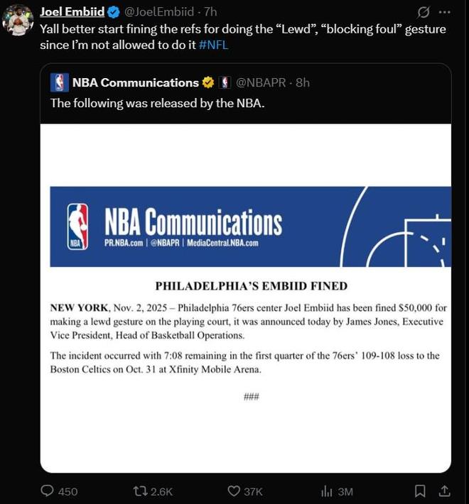 在处罚结果公布后,恩比德在社媒上转发了官方的公告,并配文写道:“既然我不被允许做那个‘猥亵’或‘阻挡犯规’的手势,你们最好开始对裁判进行罚款。”