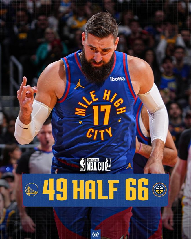 勇士队的库里因病再次缺席,巴特勒和格林一同复出。开场后格林率先命中三分,主场作战的掘金队渐入佳境,布劳恩连进三球,戈登和穆雷轮流投中三分,一波12-0的小高潮让他们反超领跑。巴特勒打3分还击,约基奇和戈登联手6分,掘金队领先12分。格林突破得分,约基奇、哈达威轮流得分,掘金队继续扩大优势。勇士队换上替补后进攻表现不错,普斯特和戴维斯合取7分,他们追至17-24。约基奇保持攻击性又得5分,戈登也命中三分,普斯特还击三分,首节结束时勇士队以21-32落后11分。格林和普斯特各中三分,他们率队以10-0的反击波开始第二节,勇士队只落后1分。掘金队暂停后穆雷开火,连中2个三分球,瓦兰丘纳斯也找到外线手感,投中两记三分,一人贡献8分,他们带领球队打出21-3的进攻高潮,半场前4分55秒时掘金队以53-34领先。波兹姆斯基和希尔德拿下5分暂时止血,穆雷保持攻击性又得8分,掘金队仍领先19分。巴特勒和理查德追回5分,约基奇三分中的,半场结束时掘金队以66-49领先。