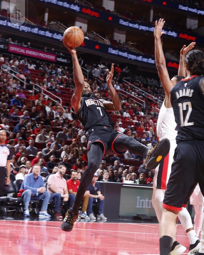 阿门2罚全中,夏普隔扣史密斯,史密斯中远距离独得5分还以颜色,火箭取得23分领先。格兰特外线命中,为开拓者止血,奥科吉补篮得分,夏普单打杜兰特命中2+1还以颜色。奥科吉失误,阿夫迪亚打成2+1,谢泼德上篮不进,阿夫迪亚远投得分,开拓者回敬了12比2的攻势。亚当斯2罚1中,杜兰特轰进三分球,火箭稳住局面。格兰特3罚全中,阿隆霍勒迪抛投得分还以颜色,阿夫迪亚连投带罚再得6分,分差仅为10分。亚当斯补篮得手,阿门2罚全中。第3节打完,火箭以105比91领先,阿夫迪亚单节砍下14分。末节决战,亚当斯补篮得分,随后大帽夏普,杜兰特轰进三分球,夏普2罚不中,谢泼德抢断后上篮得分,斯普利特请求暂停。格兰特上篮得手,谢泼德、阿隆霍勒迪相继外线发难,火箭打出了13比2的攻势,将分差扩大至25分。阿夫迪亚补篮得分,谢泼德上篮得手,火箭挑战判罚成功,卡马拉、阿夫迪亚相继内线取分。杜兰特上篮