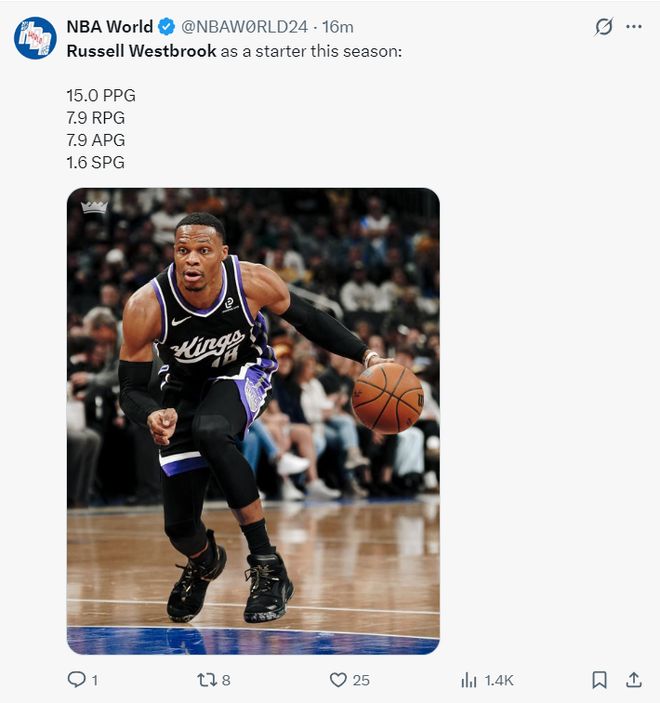 国王记者晒出威少的数据致谢道:这位 37 岁的老将竭尽全力帮助萨克拉门托国王队。