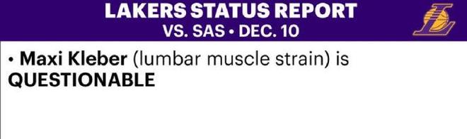 NBA杯1/4决赛正火热进行,12月11日湖人与马刺的对决会是焦点大战。如今两队的伤病报告出炉,湖人只有克勒贝尔一人出战成疑,斯马特将迎来复出,马刺则是文班亚马与3位下放发展联盟的双向球员合计4人缺席。湖人伤病报告:克勒贝尔:腰肌拉伤出战成疑马刺伤病报告:文班亚马:小腿伤势缺席麦克劳林:腿筋伤势出战成疑英格拉姆:双向球员下放G联赛缺席加西亚:双向球员下放G联赛缺席米尼克斯:双向球员下放G联赛缺席湖人核心阵容保持健康将出战,仅有克勒贝尔一人因为腰肌拉伤出战存疑,斯马特伤停6场后将迎来复出。至于湖人核心文班亚马将继续缺席,马刺依然采取稳妥策略,且本赛季缺少文班亚马的11场比赛,收获8胜3负战绩表现神勇。此外,马刺的3位双向合同球员被下放发展联盟,也将缺席与湖人的比赛。双方本赛季有过一次交锋,湖人当时主场118-116险胜马刺,两队将争夺一个NBA杯四强的名额。ESPN给出获胜概率:湖人64.2%、马刺35.8%。(文/醉卧浮生)