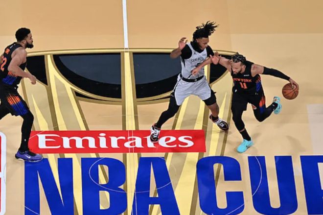 第四节决战,米罗2分钟抢下5个篮板,克拉克森连中2记三分,阿奴诺比再投进第4记三分,尼克斯开局一波13-1反超马刺7分。科内特传球后撞到对手,被判罚进攻犯规,马刺三分无效,米奇冲进场内,并怒喷裁判:“这比赛判罚他X的太离谱了!”马刺最后3分钟不得分,最终,尼克斯124-113大逆转马刺,捧起NBA杯总冠军。