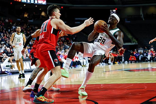 本场比赛中,被雄鹿下放到NBA发展联盟赛场进行锻炼的双向合同内线球员亚历克斯-阿德托昆博(Alex Antetokounmpo)的表现实在是糟糕透顶。阿德托昆博全场出场23分钟,投篮6中1,三分线外5中1,仅得到了3分6篮板2助攻的数据,还有4次犯规,正负值也是低到了-11。阿德托昆博在进攻端效率糟糕,不仅没有任何的篮下得分能力,而且在外线投篮方面的稳定性也是严重不足的水平。阿德托昆博在进攻端的贡献度严重不足,在防守端的表现同样是一塌糊涂的。虽然有一副好身板,但是除了这副好身板以外,他身上似乎没有任何的亮点,实在是没有办法为球队提供基本的帮助和支持,实在是在能力上差出了其他球员一大截。