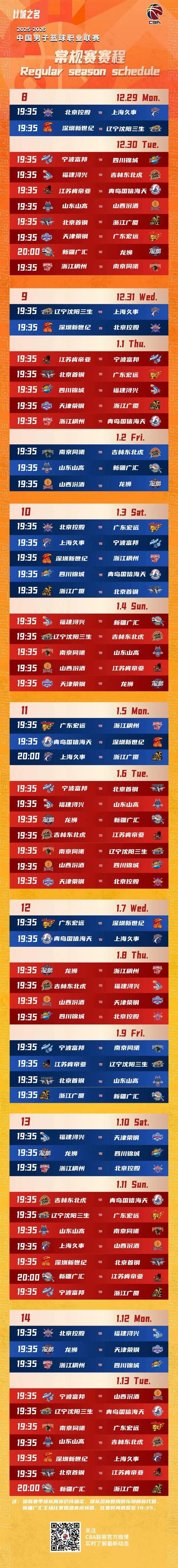 10月20日,CBA联赛公布新赛季赛程,2025-2026赛季CBA联赛常规赛将于12月12日开赛,次年4月24日收官,常规赛共42轮。其中在12月13日,新疆男篮将在主场迎来首场比赛,对手是福建男篮。2026年4月24日,新疆男篮将在最后一轮比赛中将对阵青岛男篮。