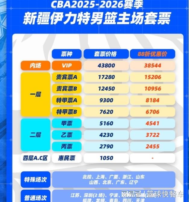 尽管距离CBA新赛季开赛还有一段时间,不过,CBA新赛季的赛程却已经提前公布了。在CBA新赛季公布不久后,新疆男篮则公布了CBA新赛季门票价格。套票价格分为9个档次,这其中最贵的达到43800元,即便打完折,也要达到38544元。而最便宜的套票,价格则是1050元。按照新赛季21个主场算计,最高套票每场比赛为1835元,而最便宜的每场只需50元。