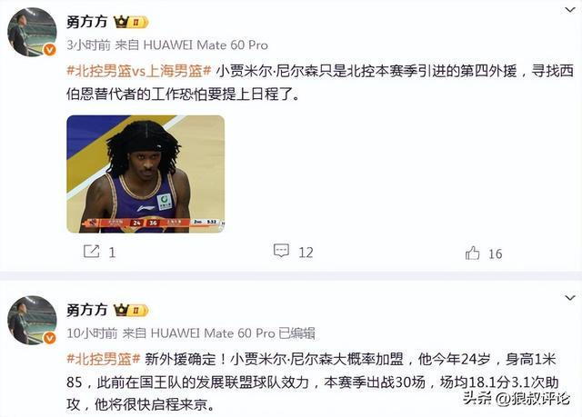 有消息称,北控男篮引进了小贾米尔·尼尔森,今年24岁,身高1米85,此前在国王队的发展联盟球队效力,本赛季出战30场,场均18.1分3.1次助攻,他将很快启程来京。北控男篮下一场将会对阵深圳男篮。