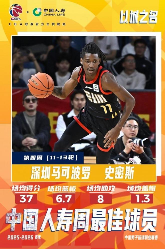 深圳外援史密斯本周出战3场,率队取得2胜1负战绩,他在场均出场30分钟可以得到37分、6.7篮板、8助攻、2抢断、1.3盖帽的全面数据,同时能够以50%的三分命中率,场均命中4.7记三分球。