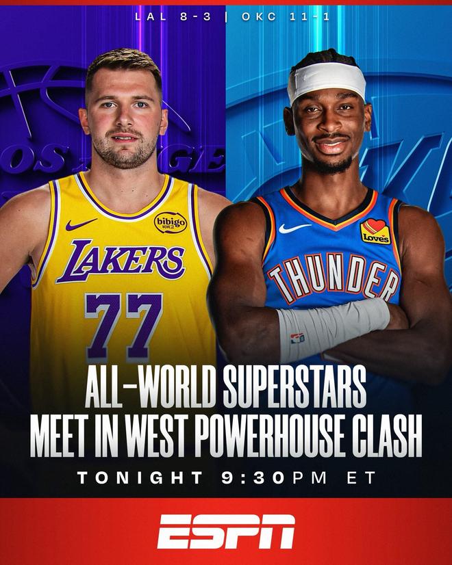 雷霆29分大胜湖人取4连胜 SGA30+5+9 东契奇&里夫斯三分12中1