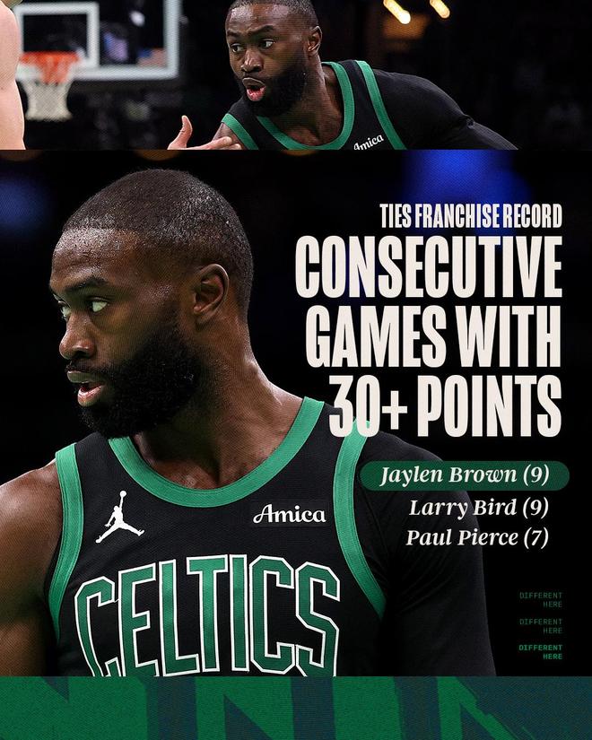 此外,布朗的篮板和助攻数据,都高居全队第二。布朗展现了全能的身手,但是却无法阻挡对手的全民皆兵。布朗已经尽力了,可谓是虽败犹荣。此战之后,凯尔特人官方晒出统计,杰伦·布朗连续9场比赛砍下30+,追平名宿拉里伯德保持的队史纪录!布朗创纪录
