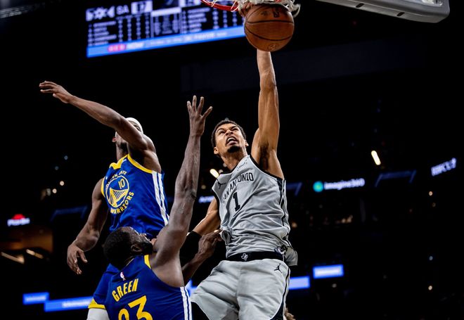 以马刺的阵容框架,本赛季守住西部前四没任何问题,区别只是在于何时冲击总冠军。看两组数据:首先,本赛季马刺WS胜场贡献值在1.5以上的,有8人,全联盟最多!其次,马刺全队BPM值在2.5以上的,也是8人,还是全联盟最多!哪有什么大牌和绝对核心,在马刺,文班亚马有战术要求也只能打替补!以马刺当下配置,他们缺一个合格的四号位,巴恩斯确实老了,尚帕尼略显稚嫩,但他们成长上限很高。此外还有丰富的签位筹码可用,文班亚马也才刚年满22岁。拔苗助长不是最佳选项!